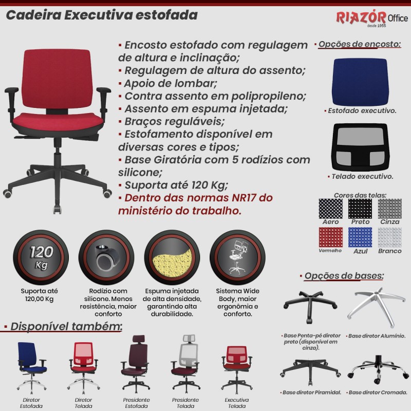 A cadeira executiva com encosto estofado – RZPM/BZ-EX é totalmente ergonômica, atendendo as normas da NR17 do Ministério do Trabalho. Com 3 tipos de mecanismos (Relax, Sincron e Back System) disponíveis para escolher, ela se torna uma ótima opção para seu ambiente de trabalho. Feita com encosto em tela, assento com espuma injetada especial e 4 opções de bases para a cadeira (Alumínio, Cromada, Preta e Piramidal), mais de 42 opções de cores (solicitar por e-mail catálogo completo) essa cadeira é uma das mais completas do segmento, sendo perfeita para seu escritório ou Home Office. Veja outras opções de móveis para escritório .