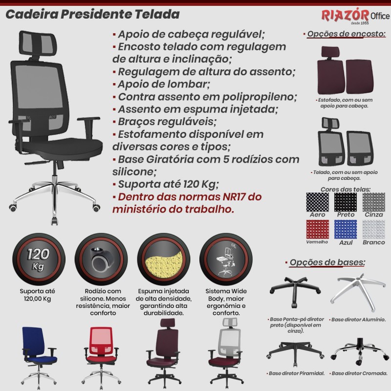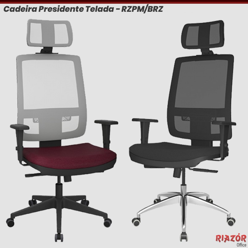A cadeira presidente com encosto em tela – RZPM/BZ é totalmente ergonômica, atendendo as normas da NR17 do Ministério do Trabalho. Com 3 tipos de mecanismos (Relax, Sincron e Back System) disponíveis para escolher, ela se torna uma ótima opção para seu ambiente de trabalho. Feita com encosto em tela, assento com espuma injetada especial e 4 opções de bases para a cadeira (Alumínio, Cromada, Preta e Piramidal), mais de 42 opções de cores (solicitar por e-mail catálogo completo) essa cadeira é uma das mais completas do segmento, sendo perfeita para seu escritório ou Home Office. Veja outras opções de móveis para escritório .