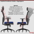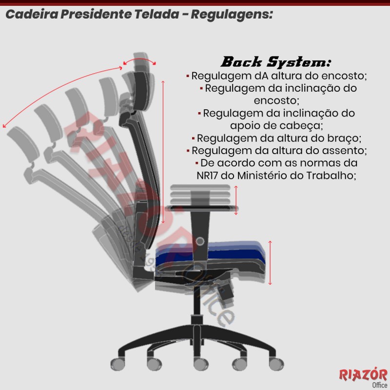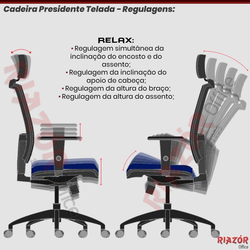 – Regulagem simultânea da inclinação do encosto e do assento com proporção 2º x 1º;