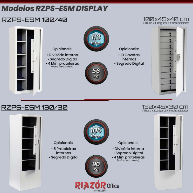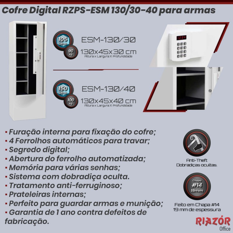 Cofre com display digital e com segredo eletrônico RZPS-ESM 130/30-40 PARA ARMAS possui uma divisória na vertical e 4 prateleiras para melhor distribuição e armazenamento de armas e munição. Possui proteção contra invasores que bloqueia a abertura após três tentativas incorretas de senha. Além disso, este cofre eletrônico possui senha mestra para abertura através do suporte 24h. Este modelo de cofre digital é econômico, o sistema eletrônico é desligado quando inativo. Pilhas localizadas no exterior do cofre. Inclui kit de fixação.