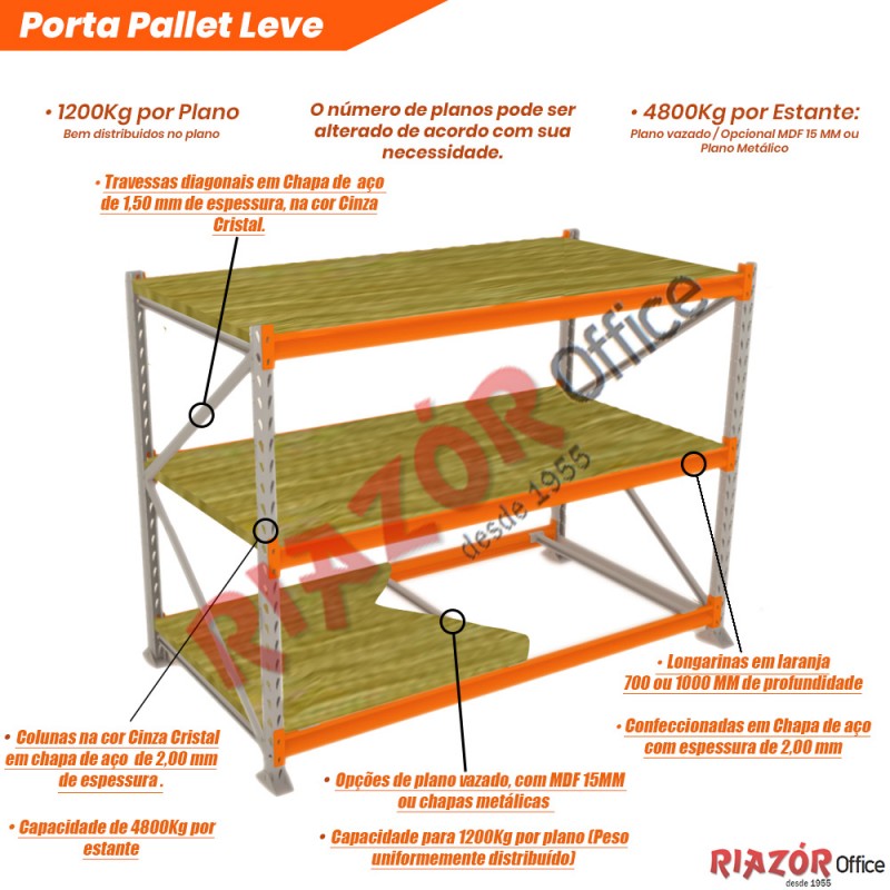 As Estantes Porta Palete Leve RZW/EPP são robustas, aguentam 1200Kg por prateleira e um total de 4800Kg por estante. Colunas confeccionadas em chapa de aço estrutural com 2,00 mm de espessura, travessas e diagonais em chapa de aço zincada com 1,50 mm de espessura. Recebe aplicação de tinta em pó hibrida, sendo que a polimerização ocorre em estufas com temperaturas próximas à 200 ºC, garantindo durabilidade, uniformidade e beleza aos arquivos. O produto ganha tratamento anti-ferruginoso recebendo desengraxe, proteção fosfática, enxague e aplicação de passivador inorgânico.