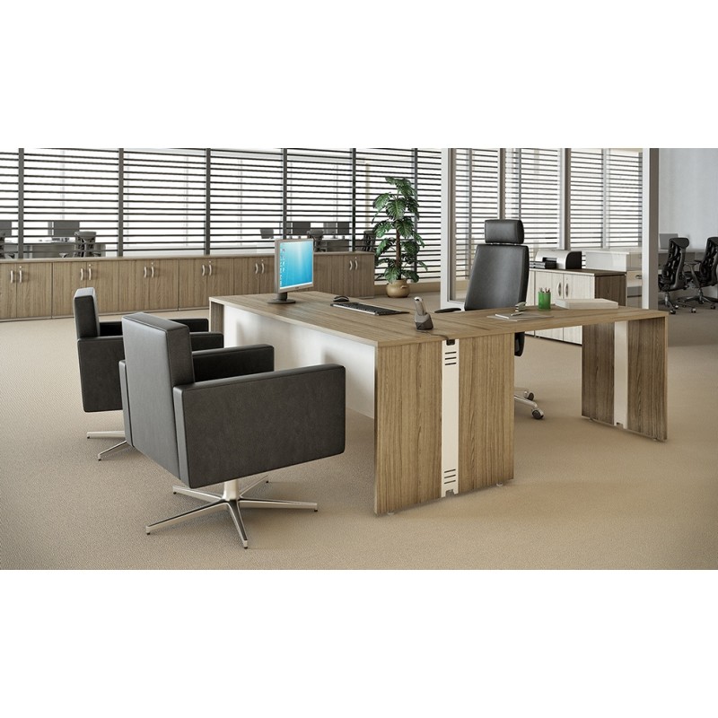 Ambientes organizados e bem compostos proporcionam mais conforto e bem-estar aos colaboradores, e ainda, ganham elogios dos visitantes. A Mesa executiva RZMV/ATT foi desenvolvida pensando nisso. Possui requinte e sofisticação, integrados a um conjunto completo de móveis desenhados para o ambiente de trabalho. A coleção inclui mesa com várias opções de combinações. Com vários tamanhos e cores a escolher, traz design clean e atual para melhor se adequar à sua necessidade. Com tampo e pés em BP – 25mm e saia em BP – 18mm ou aço carbono garantem boa qualidade ao conjunto e contam calha elétrica para instalação elétrica.