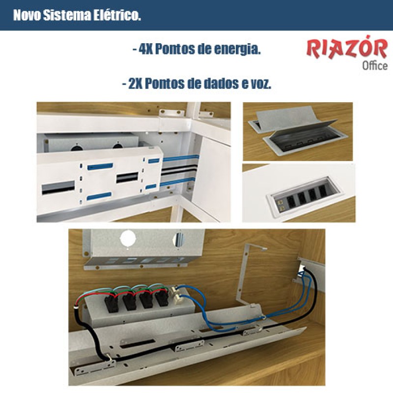- Praticidade e comodidade com calha para elétrica e suporte para tomadas (4 pontos de tomadas e 2 pontos de voz/dados).